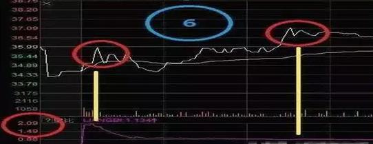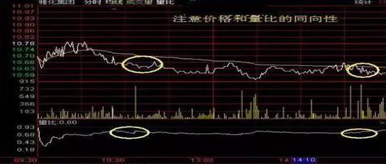 开盘时量比由下行后很快向上运行,形成了V字型量比,这表明了量比由放量到缩量,再放量的一个过程。若量比值在1以上,在分时线态势良好,则表现一种上攻的态势。若量比值在1倍以下时,若股价处于底部附近,则是主力潜收集的过程,说明主力没有发动大举的推筹行为;若处于中高位置时或一些重要的技术关口时,则表明此时抛压较轻,可根据情况展开买卖操作。