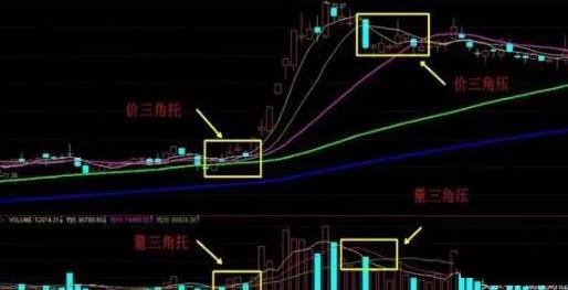 3、量三角托、三角压与价三角托、三角压的关系:在量增价涨初期和量减价跌的初期,量能均线往往会提前于价格均线形成金叉或死叉,对股价起到提前预警的作用。